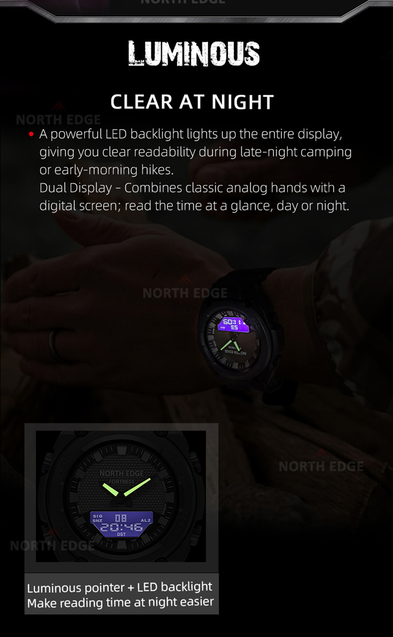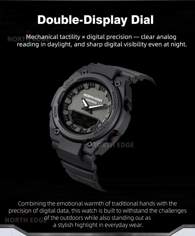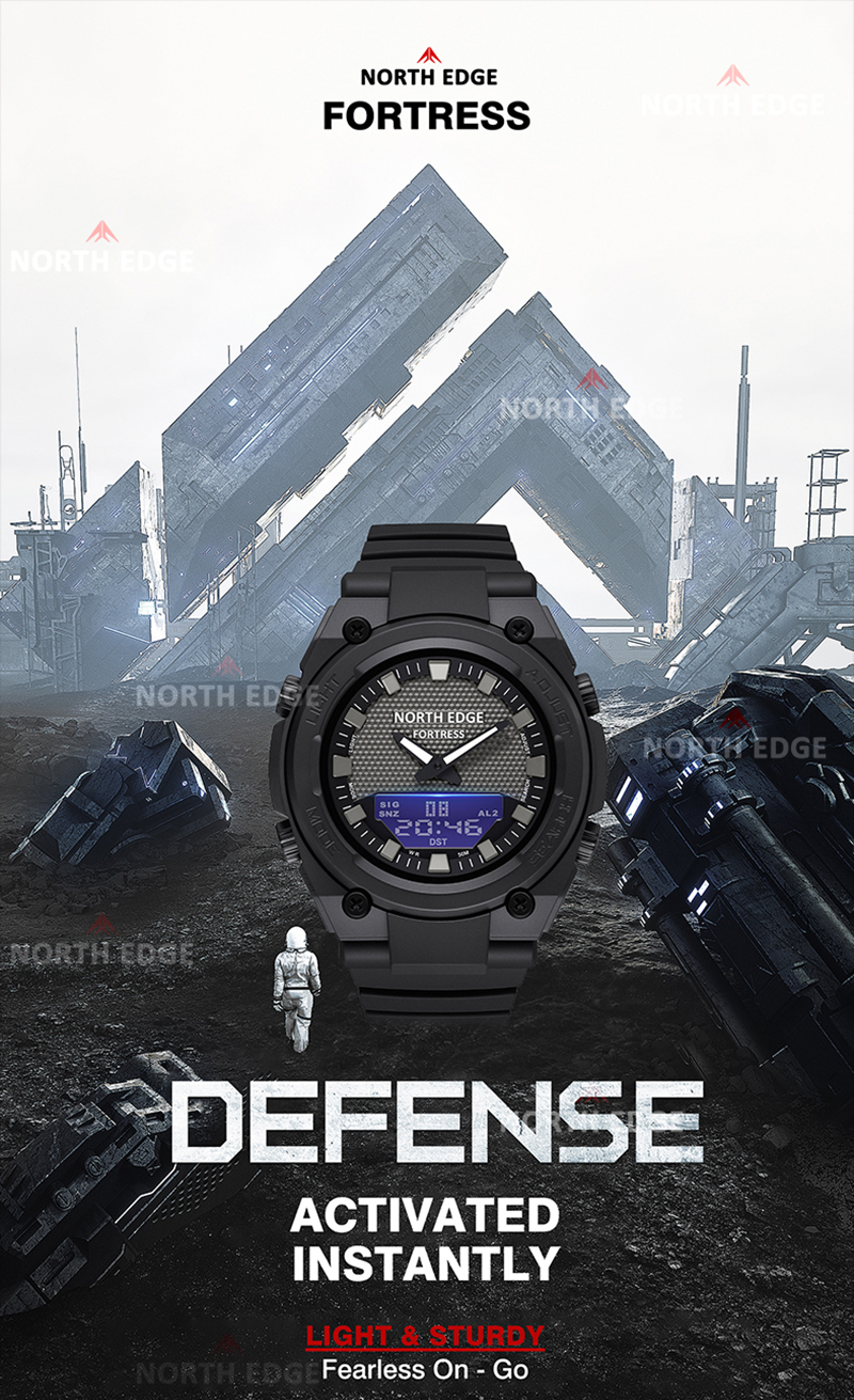 North Edge Fortress este un ceas sport puternic și bine echilibrat, creat pentru cei care au nevoie de fiabilitate, funcții avansate și un design solid, cu aspect tactic. Combinația dintre afișajul analogic și cel digital oferă o citire rapidă și clară a timpului, indiferent de condiții.