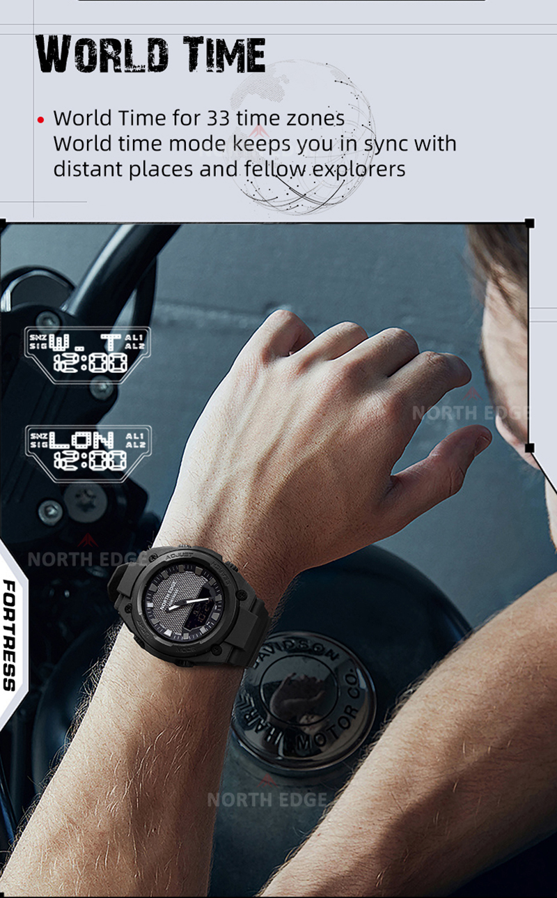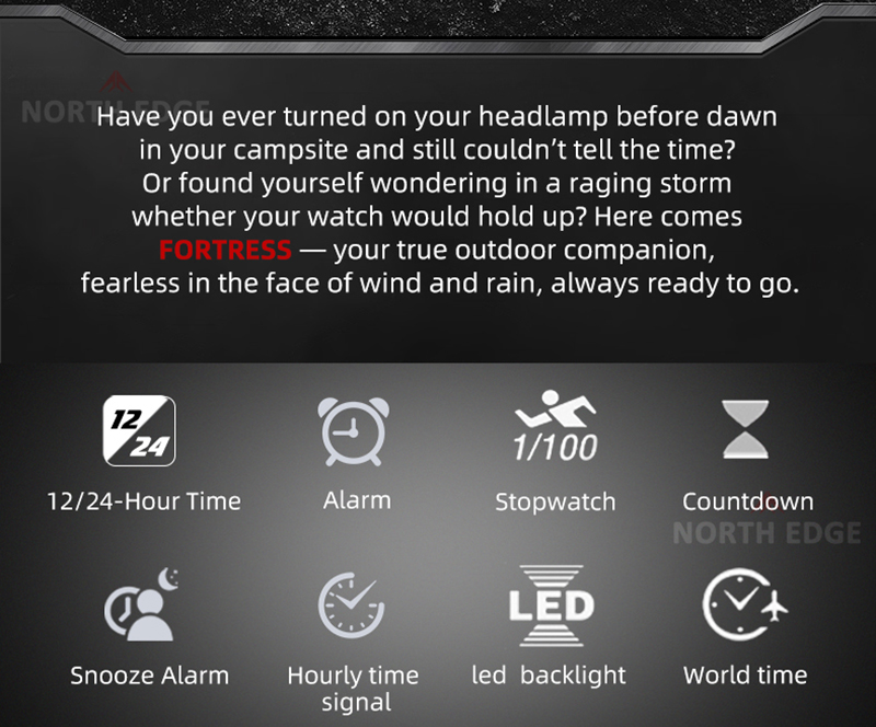 Funcția World Time include 30 de orașe din 29 de fusuri orare, cu posibilitatea activării orei de vară (DST), fiind ideal pentru călătorii internaționale. North Edge Fortress este echipat cu două alarme independente, funcție Snooze, precum și semnal orar.