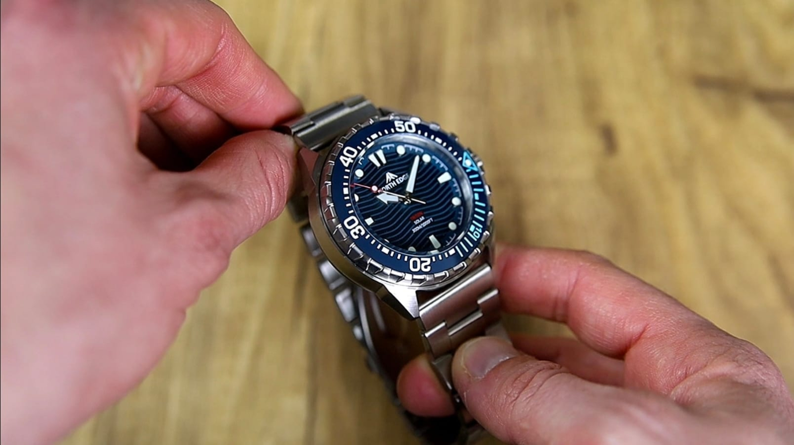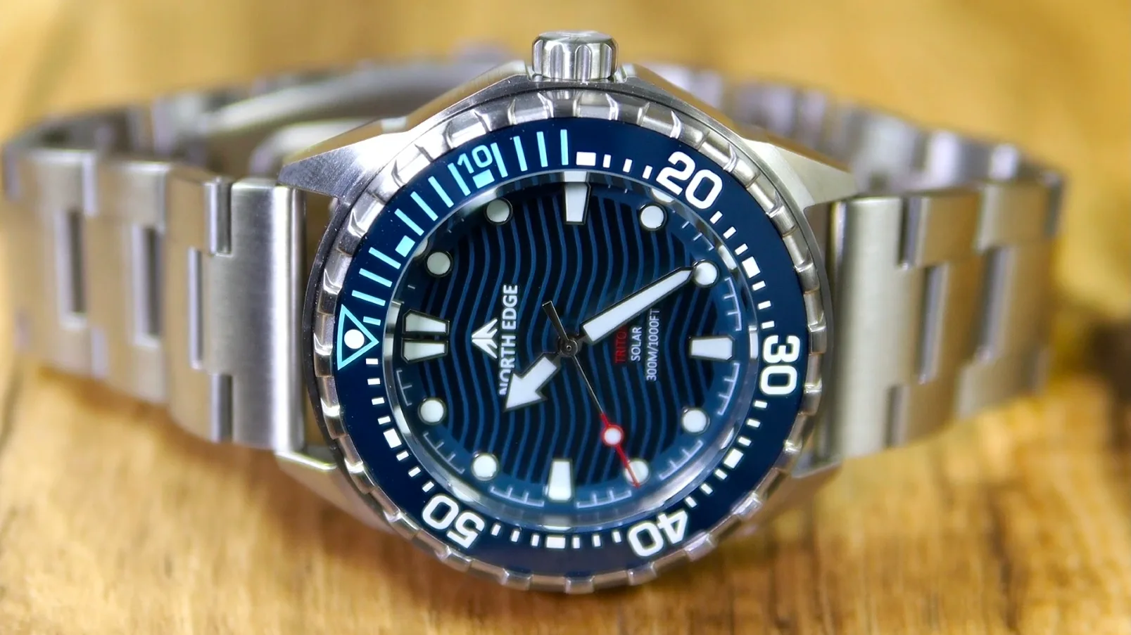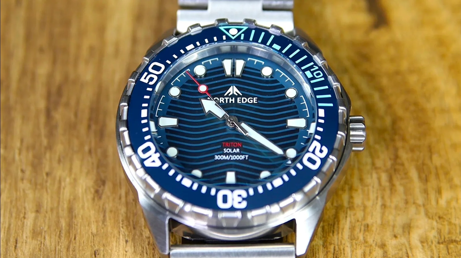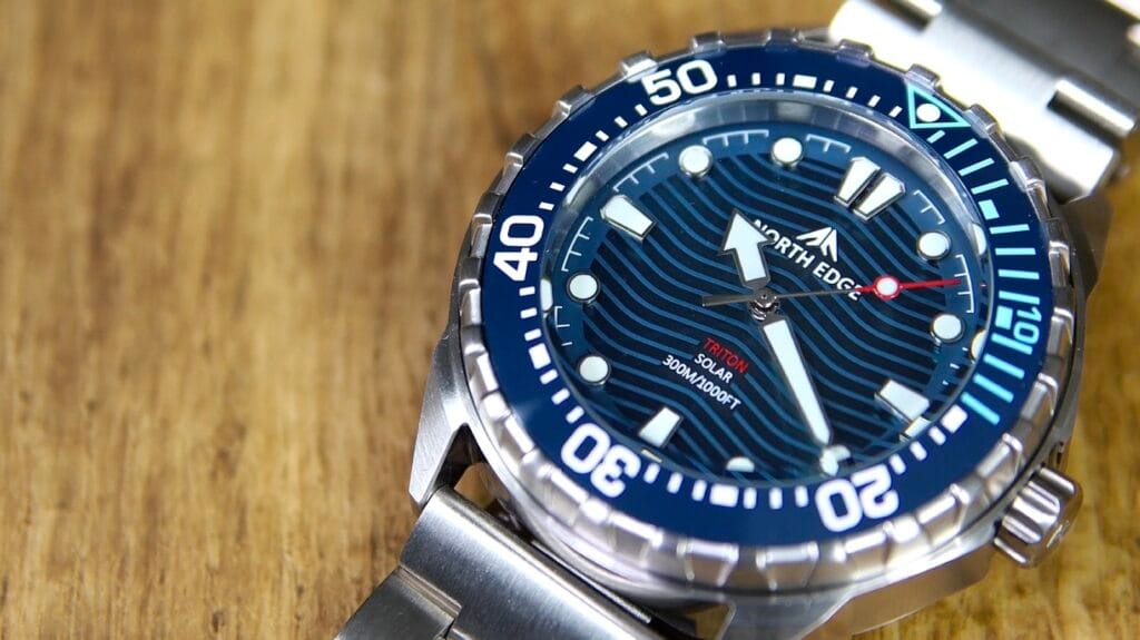 Brandingul este redus la strictul necesar, cu logo-ul „North Edge” poziționat sub ora 12 și denumirea „Triton” deasupra orei 6, alături de inscripția rezistenței la apă de 300 m.