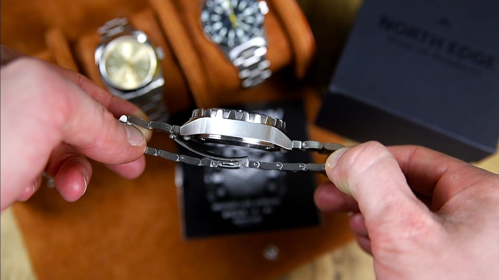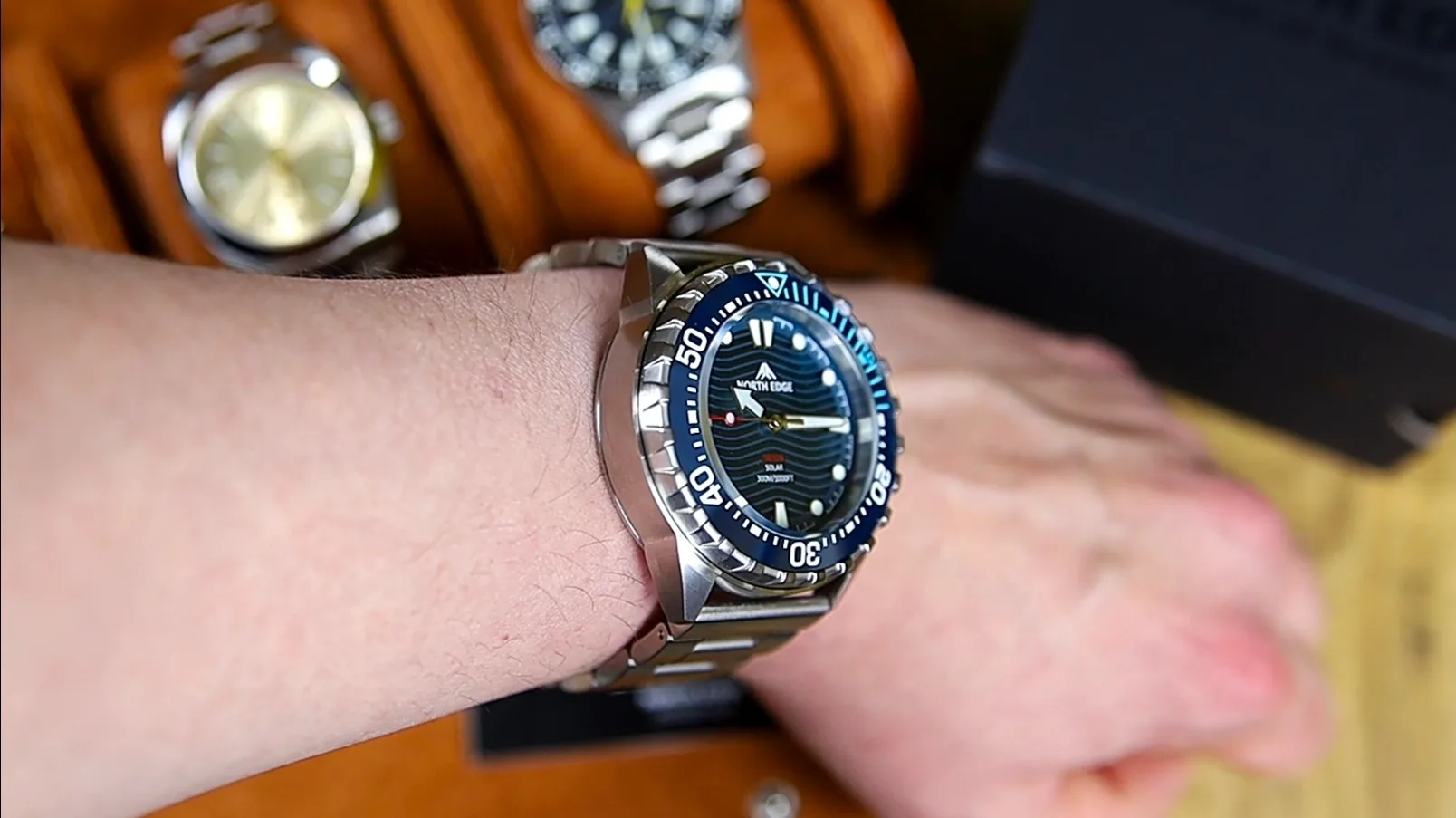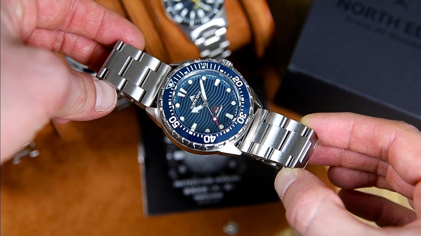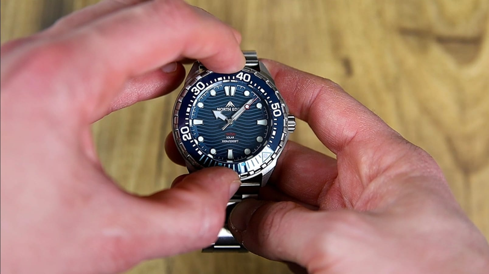 Brandingul este redus la strictul necesar, cu logo-ul „North Edge” poziționat sub ora 12 și denumirea „Triton” deasupra orei 6, alături de inscripția rezistenței la apă de 300 m.